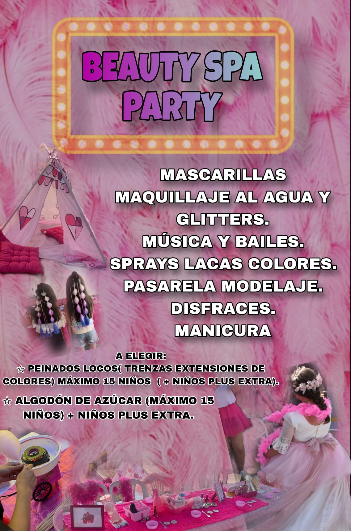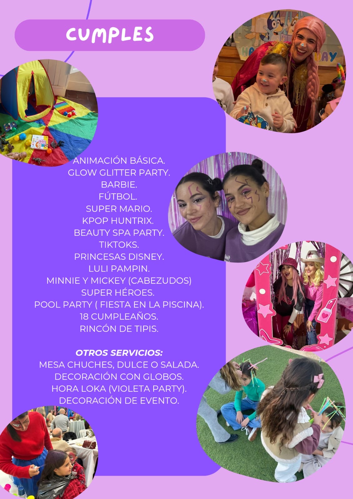 Incluye 1 animador durante 2 horas. Juegos grupales, pintacaras, globoflexia y personaje temático a elegir (princesa, superhéroe, etc.).
